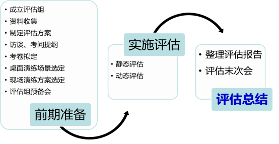 2 | 評(píng)估組 | 1. 預(yù)防與應(yīng)急準(zhǔn)備,應(yīng)急隊(duì)伍及應(yīng)急物資裝備調(diào)查; 2. 風(fēng)險(xiǎn)監(jiān)測(cè); 3. 應(yīng)急處置與救援; 4. 事后恢復(fù)與重建 5. 動(dòng)態(tài)評(píng)估(1~3訪談、考問、考試) |